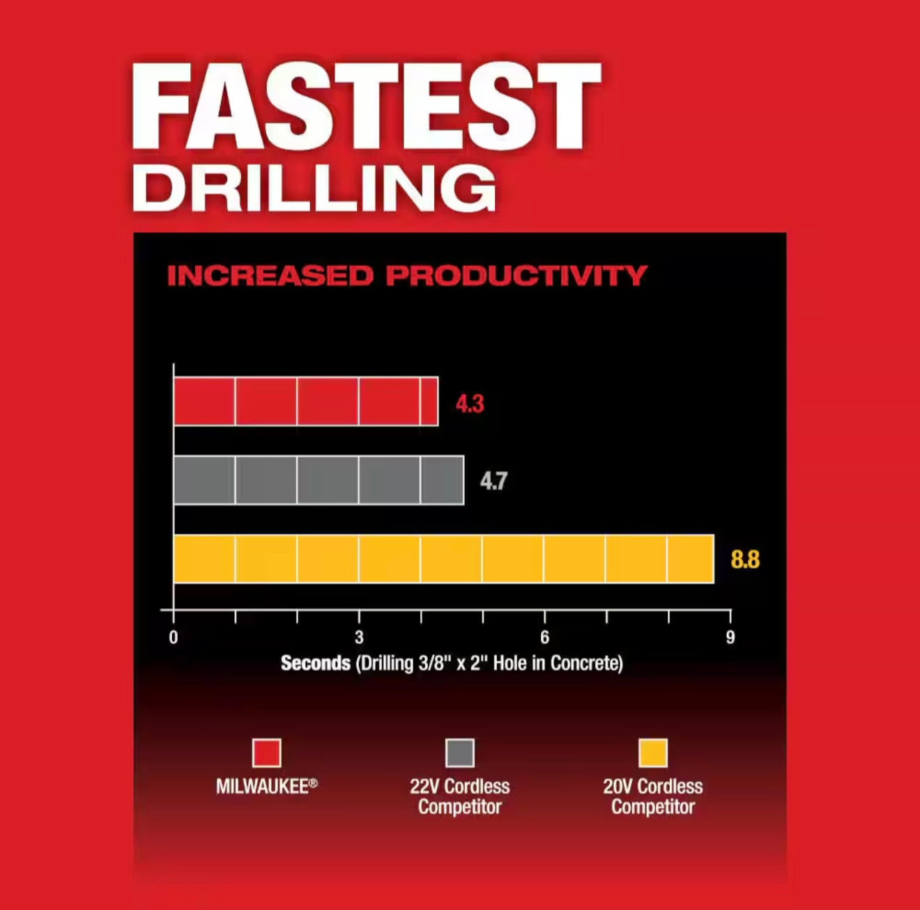 The Milwaukee M18 FUEL 1 in. SDS Plus Rotary Hammer is the next generation of cordless rotary hammer drills delivering users ultimate jobsite performance and productivity. The M18 FUEL 1 in. SDS Plus Rotary Hammer is the fastest drilling rotary hammer in its class, includes AUTOSTOP Control for enhanced safety, and can drill up to (125) 3/8 in. x 2 in. holes per charge when paired with the M18 HIGH OUTPUT XC6.0 Battery. The POWERSTATE Brushless Motor delivers users 2 ft.-lbs. of impact energy, 1,330 RPM, and 4,800 BPM, providing speed and power in the most demanding applications. REDLINK PLUS intelligence tool technology ensures maximum rotary drill performance and protects it from overload, overheating, and over-discharge. The M18 REDLITHIUM HIGH OUTPUT XC6.0 Battery delivers 50% more power while running 50% cooler than the M18 REDLITHIUM XC batteries. This hammer provides maximum control and enhanced safety with the AUTOSTOP Kickback Control. This feature prevents over-rotation if the tool gets bound up while users are drilling in rebar or hard aggregate.