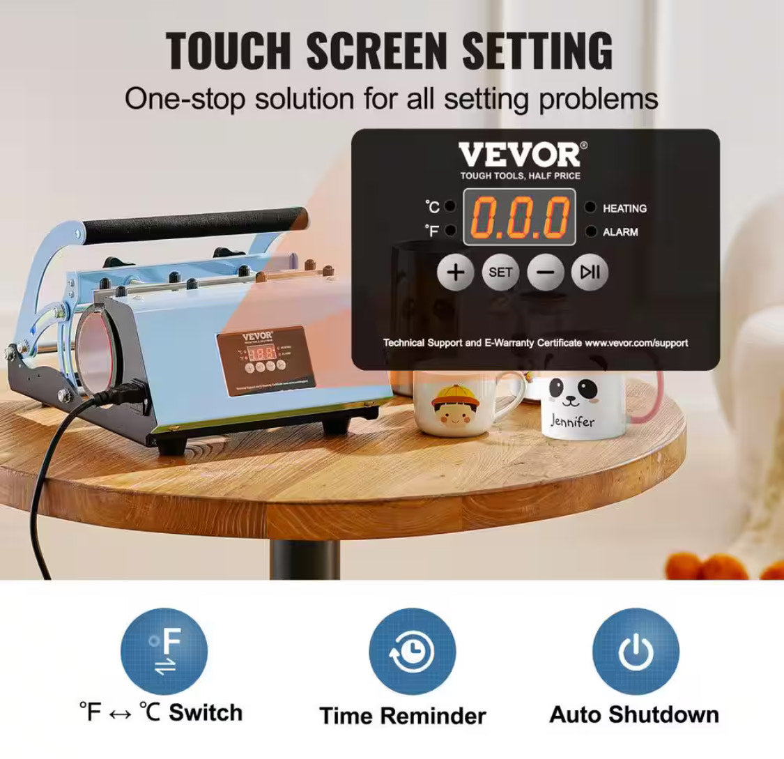 - Easy Sublimation: With a touchscreen interface, our mug heat press frees you from complex setup. Design and print your desired artwork, cleverly cut it to fit the mug, secure the sublimation paper with heat-resistant tape, and then set the time and temperature on the machine.